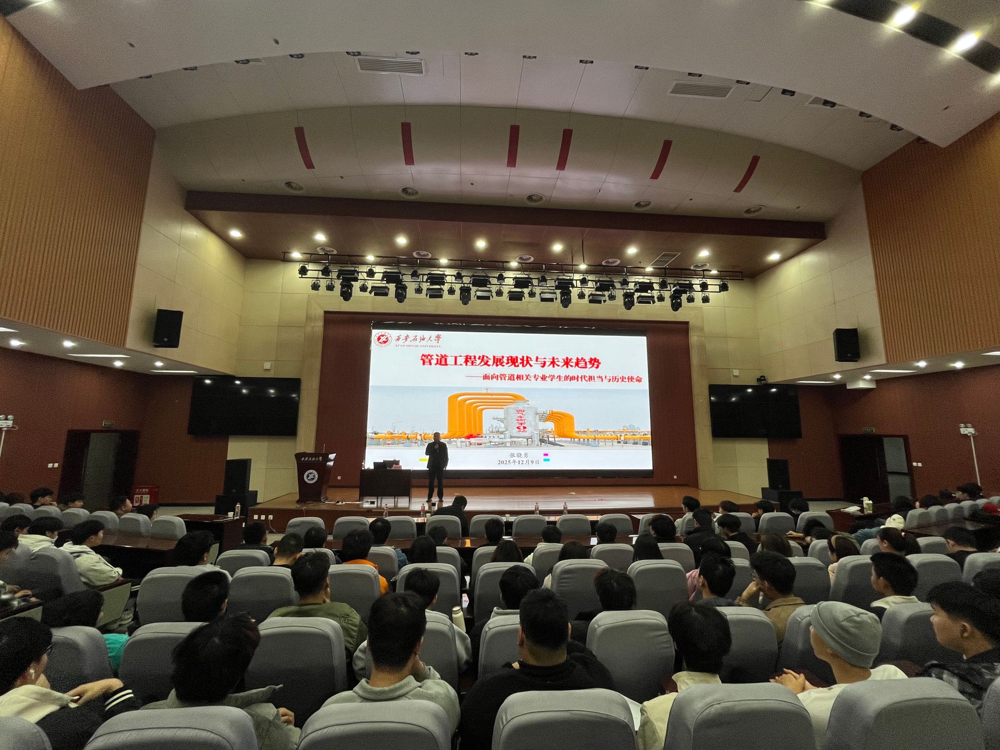 張驍勇以宏闊的全球視野和深遠的戰(zhàn)略眼光,圍繞“全球能源發(fā)展現(xiàn)狀”“國外管道工程領(lǐng)域現(xiàn)狀”“國內(nèi)管道工程領(lǐng)域發(fā)展情況”“管道工程領(lǐng)域未來發(fā)展趨勢”“管道學子的使命擔當”等五個方面展開授課。他援引大量前沿數(shù)據(jù)與典型案例,生動解讀了全球能源格局深刻調(diào)整與能源結(jié)構(gòu)轉(zhuǎn)型的時代趨勢,系統(tǒng)梳理了國際管道建設(shè)的戰(zhàn)略布局與通道格局,深情回顧了我國管道事業(yè)從無到有、由弱圖強的奮斗征程,特別強調(diào)了以“八三”精神為代表的優(yōu)良傳統(tǒng)如何鑄就行業(yè)脊梁、激勵一代代管道人砥礪前行。他指出,管道作為國家能源戰(zhàn)略通道與國民經(jīng)濟動脈,其重要性日益凸顯。當前,管道工程相關(guān)學科正朝著綠色化、智能化、融合化的方向加速演進,并且分享介紹了國家管網(wǎng)集團在“多介質(zhì)靈活輸送”“新型材料與高效建設(shè)”“數(shù)字孿生與智能運輸”、“量子技術(shù)融合”“大型管網(wǎng)仿真和優(yōu)化”“本質(zhì)安全”“標準化與體系重構(gòu)”等七大關(guān)鍵領(lǐng)域的攻關(guān)方向,這些前沿領(lǐng)域既代表了國家重大戰(zhàn)略需求,也為同學們成長成才提供了前所未有的時代機遇與歷史舞臺。