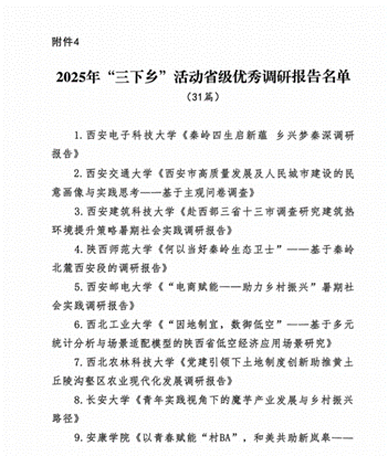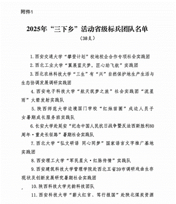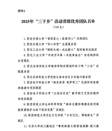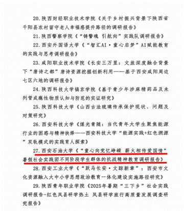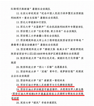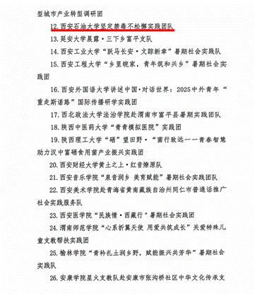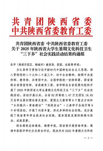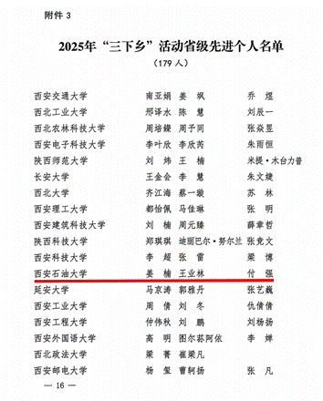 近日,共青團(tuán)陜西省委、中共陜西省委教育工委在全省范圍內(nèi)組織開展的2025年陜西省大學(xué)生暑期文化科技衛(wèi)生“三下鄉(xiāng)”社會(huì)實(shí)踐活動(dòng)評(píng)選表彰結(jié)果揭曉,我校電子工程學(xué)院堅(jiān)定禁毒不松懈實(shí)踐團(tuán)隊(duì)被評(píng)為省級(jí)標(biāo)兵團(tuán)隊(duì),石油工程學(xué)院鐵人足跡探尋與文化賡續(xù)實(shí)踐團(tuán)、機(jī)械工程學(xué)院四載堅(jiān)守基層情懷,共筑退伍軍人新生路—西安石油大學(xué)連續(xù)4年開展基層退伍士兵調(diào)研與幫扶社會(huì)實(shí)踐活動(dòng)團(tuán)被評(píng)為省級(jí)優(yōu)秀團(tuán)隊(duì),姜楠、王業(yè)林、付強(qiáng)被評(píng)為省級(jí)先進(jìn)個(gè)人,馬克思主義學(xué)院《童心向黨憶崢嶸薪火相傳愛國(guó)情暑假社會(huì)實(shí)踐團(tuán)不同階段學(xué)生群體的抗戰(zhàn)精神教育調(diào)研報(bào)告》被評(píng)為省級(jí)優(yōu)秀調(diào)研報(bào)告,并獲團(tuán)省委專項(xiàng)資助。
