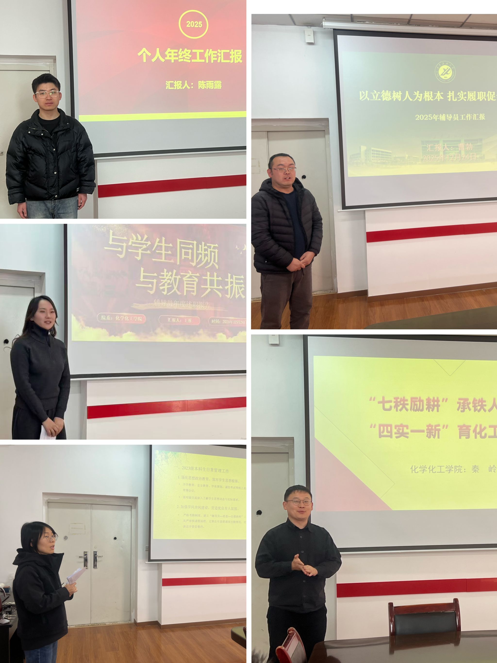 為進(jìn)一步加強(qiáng)輔導(dǎo)員隊伍建設(shè),全面總結(jié)學(xué)院年度學(xué)生工作成效,提升育人工作科學(xué)化、精細(xì)化水平,12月24日下午15:00,化學(xué)化工學(xué)院于學(xué)院316會議室召開2025年度輔導(dǎo)員工作述職會,學(xué)院各年級輔導(dǎo)員參加述職。會議由學(xué)院黨委副書記喬曉主持。