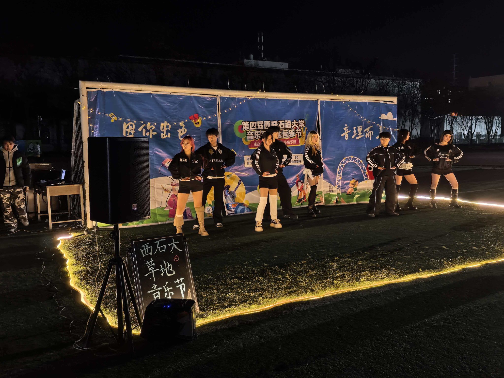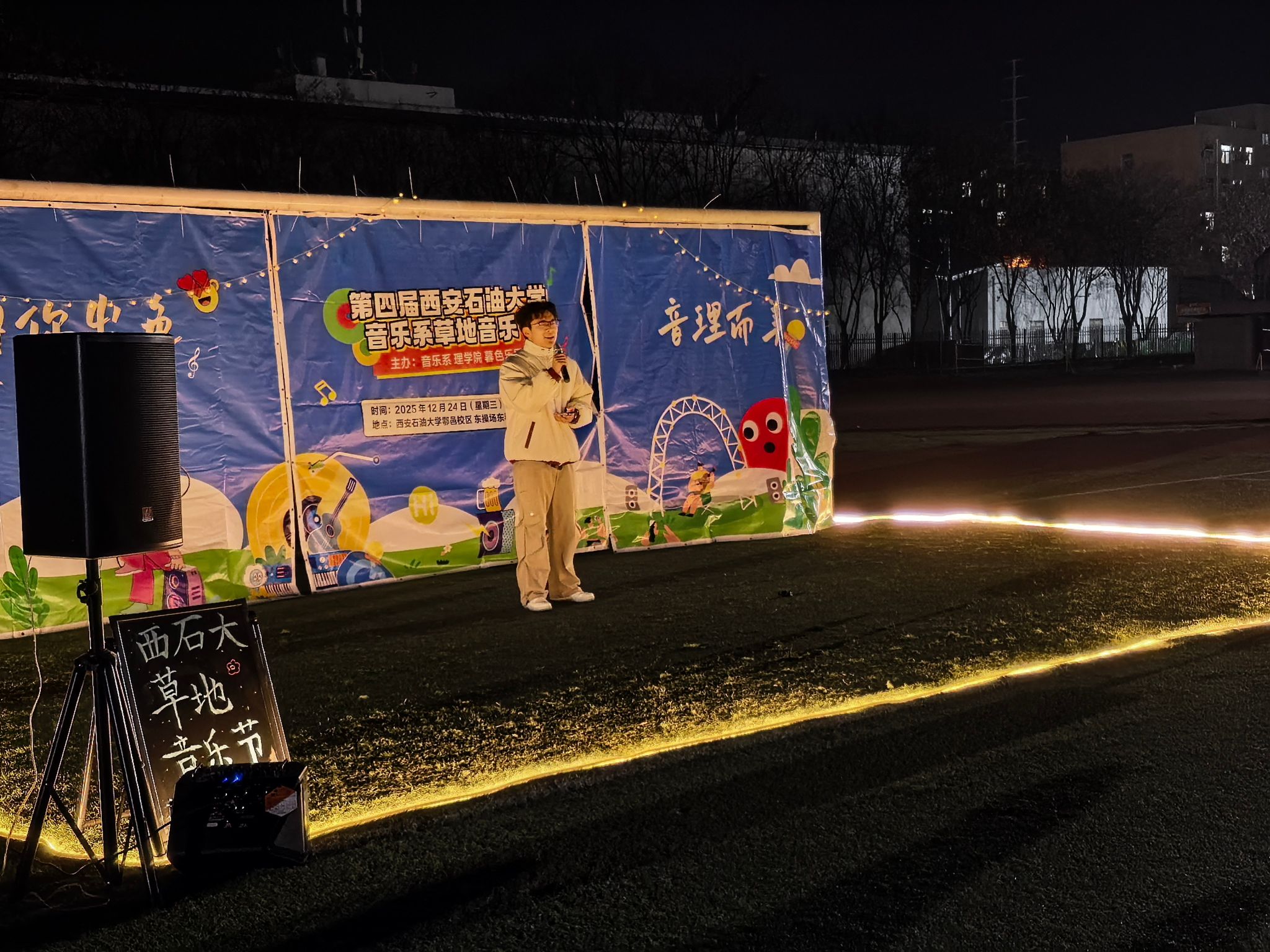 迎著晚風(fēng),踏著青草。星空為幕,草地為席。音浪嗨到頂,青春不設(shè)限!12月23日晚,音樂系、理學(xué)院舉辦的“因你出色,音理而美”草地音樂節(jié)在鄠邑校區(qū)東操場精彩上演。理學(xué)院團(tuán)委書記龐波、輔導(dǎo)員林曄、音樂系新生輔導(dǎo)員張健和200余名學(xué)生共同觀看了此次音樂節(jié)。