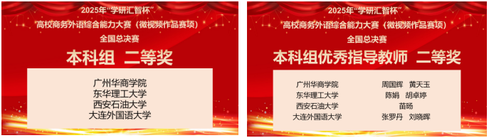 2025年12月27日,由中國國際貿(mào)易學(xué)會主辦,北京學(xué)研匯智網(wǎng)絡(luò)科技有限公司聯(lián)合主辦的第五屆“學(xué)研匯智杯”高校商務(wù)外語綜合能力大賽(微視頻作品賽項)(以下簡稱“大賽 ”)全國總決賽成功舉辦。我校共有4支隊伍晉級升級復(fù)賽,最終一支隊伍闖入全國總決賽并獲得第二名的好成績。