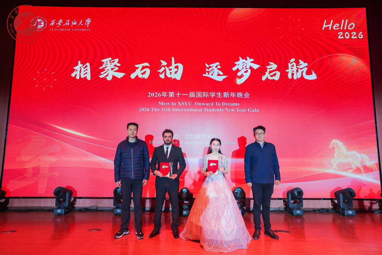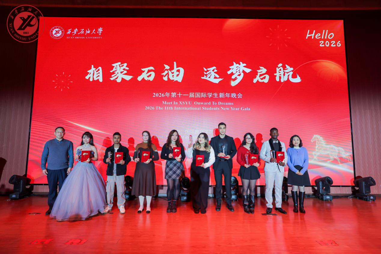 12月30日晚,國際教育學(xué)院在鄠邑校區(qū)弘石報告廳成功舉辦“相聚石油·逐夢啟航”2026年第十一屆國際學(xué)生新年晚會。國際合作與交流處處長、國際教育學(xué)院院長董皓致辭,新能源學(xué)院黨委書記顏庭星、保衛(wèi)處副處長王書華、外國語學(xué)院副院長陳武蒞臨現(xiàn)場,處(院)領(lǐng)導(dǎo)秦璟、黃愷,國際學(xué)生工作辦公室全體干部及500余名中外學(xué)生共同觀看。