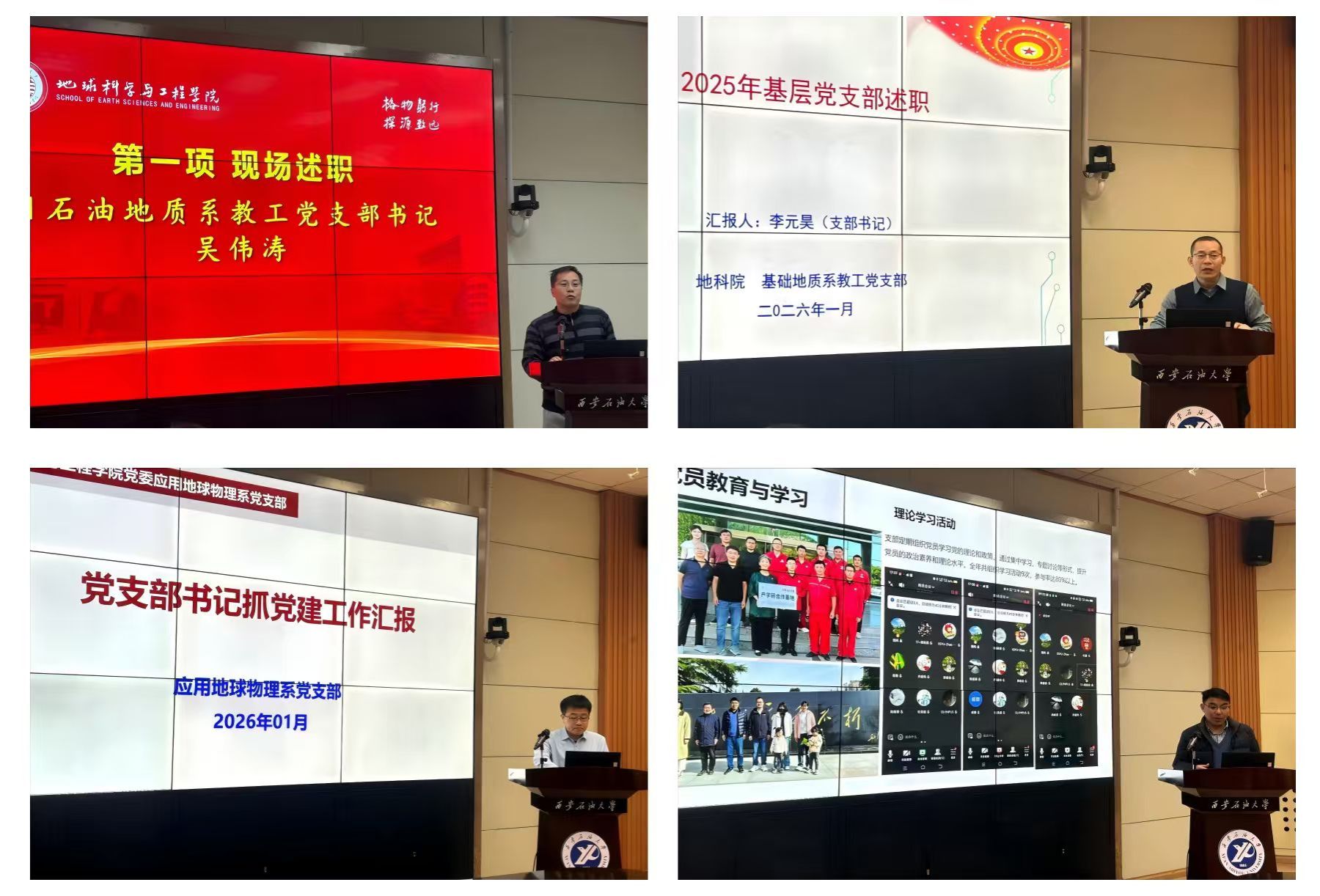 會上,石油地質(zhì)系、基礎(chǔ)地質(zhì)系、應(yīng)用地球物理系、地質(zhì)工程系4個教工黨支部書記吳偉濤、李元昊、趙軍龍、郭峰等依次進(jìn)行現(xiàn)場述職。各支部書記嚴(yán)格對標(biāo)履行抓基層黨建第一責(zé)任人職責(zé)要求,圍繞深入學(xué)習(xí)貫徹黨的創(chuàng)新理論、貫徹落實上級決策部署、履行全面從嚴(yán)治黨責(zé)任、落實基層黨建重點任務(wù)、推動黨建與中心工作深度融合等方面,全面匯報了一年來的工作成效,深入剖析存在問題,明確下一步改進(jìn)方向和工作舉措。