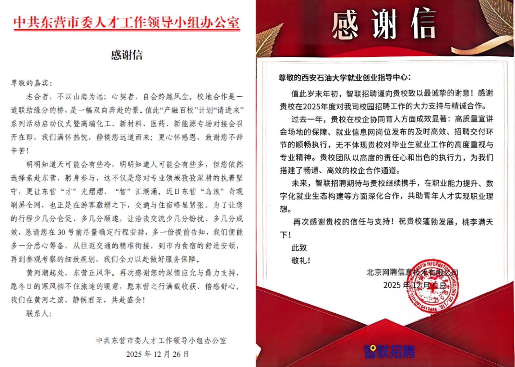 近日,我校就業(yè)創(chuàng)業(yè)指導(dǎo)中心陸續(xù)收到來自多地政府人社部門及用人單位的感謝信。字里行間飽含著對(duì)我校人才培養(yǎng)質(zhì)量的高度認(rèn)可和對(duì)學(xué)校關(guān)于就業(yè)組織、指導(dǎo)服務(wù)等工作的高度贊許,希望校地、校企攜手并進(jìn),續(xù)寫人才供需對(duì)接新篇章。