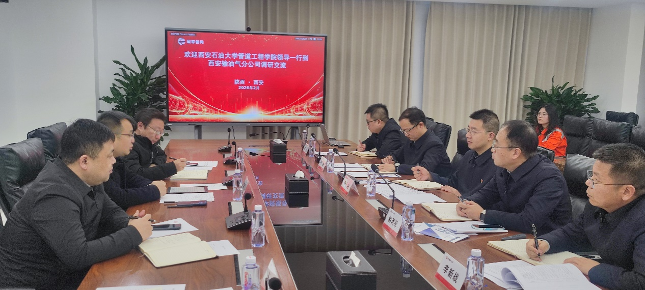 為深化產(chǎn)教研融合、拓展學(xué)生就業(yè)渠道、推動(dòng)學(xué)院高質(zhì)量發(fā)展,2月5日上午,管道工程學(xué)院院長蔣華義率隊(duì)前往國家管網(wǎng)集團(tuán)西北公司西安輸油氣分公司開展校企交流座談。學(xué)院黨委副書記高亮、副院長代建波、院長助理王勇陪同走訪。國家管網(wǎng)集團(tuán)西北公司西安輸油氣分公司黨委書記張小俊、分公司副經(jīng)理鐘利軍、羅毅、李新戰(zhàn),生產(chǎn)運(yùn)行部經(jīng)理王龍、管道管理部二級(jí)工程師王帥等出席座談會(huì)。