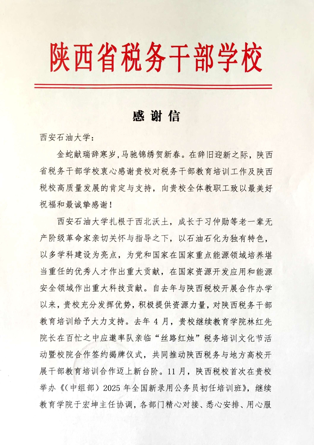 近日,陜西省稅務(wù)干部學(xué)校向我校發(fā)來感謝信,對我校在過去一年中給予的支持與協(xié)作表示誠摯謝意,并高度肯定了雙方在干部培訓(xùn)、資源共享與社會(huì)服務(wù)等方面取得的務(wù)實(shí)成果。