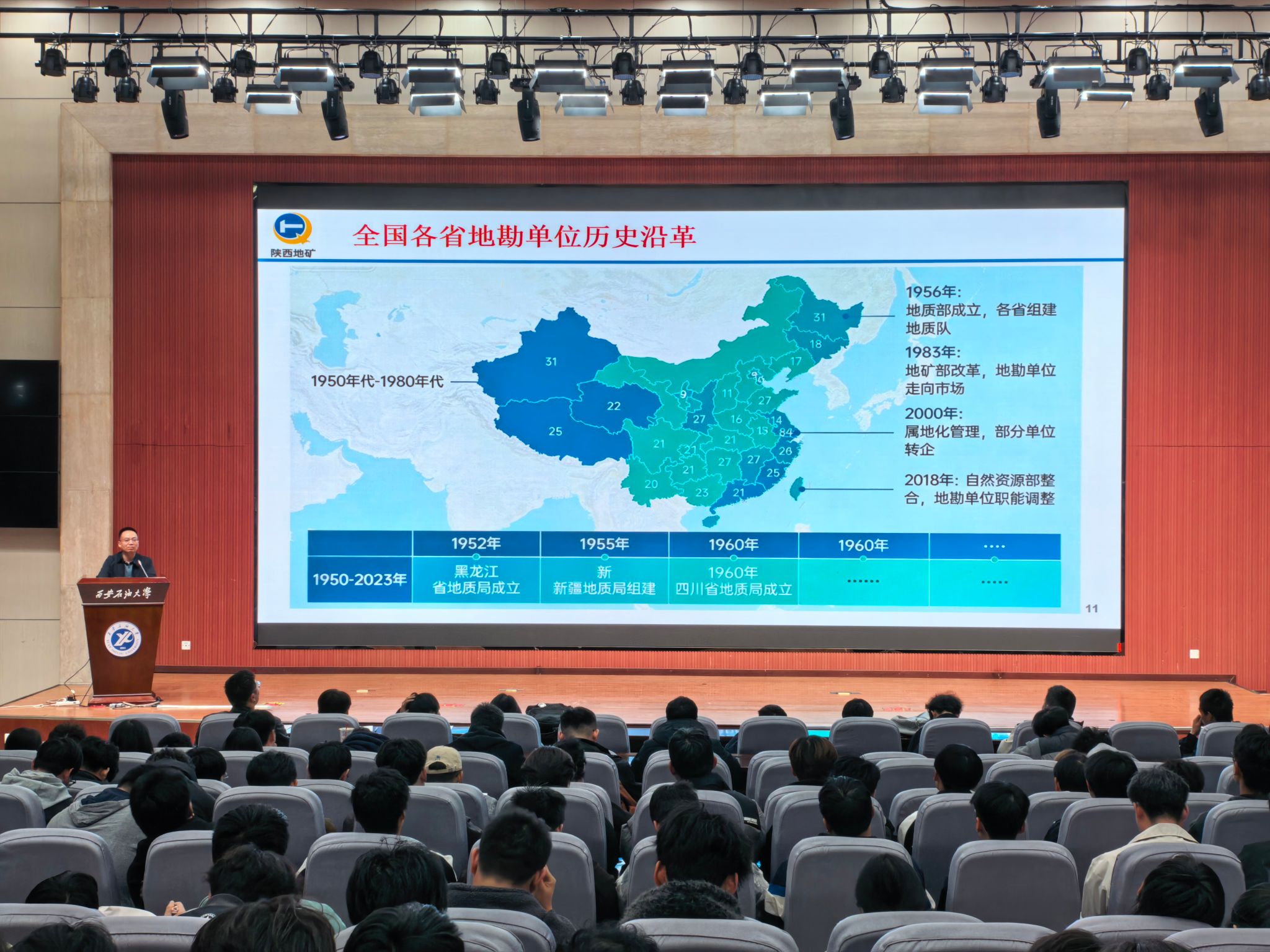 講座伊始,劉建利結(jié)合自身豐富的地質(zhì)工作經(jīng)歷和專業(yè)知識背景,系統(tǒng)梳理了地礦行業(yè)的發(fā)展歷程與當(dāng)前現(xiàn)狀。他深入淺出地分析了在全球科技革命和產(chǎn)業(yè)變革背景下,地礦行業(yè)所面臨的轉(zhuǎn)型挑戰(zhàn)與未來發(fā)展的新機(jī)遇。圍繞行業(yè)對高校人才的需求導(dǎo)向,劉建利強(qiáng)調(diào)新時代地礦人才需要著力培養(yǎng)實(shí)踐能力、團(tuán)隊協(xié)作、學(xué)習(xí)創(chuàng)新和責(zé)任擔(dān)當(dāng)?shù)暮诵乃仞B(yǎng),同時傳承和發(fā)揚(yáng)“敢擔(dān)當(dāng)、能吃苦、持之以恒”的新時代地質(zhì)人“三光榮”精神。劉建利還介紹了陜西地礦集團(tuán)的基本情況、業(yè)務(wù)領(lǐng)域以及員工培養(yǎng)體系和職業(yè)發(fā)展路徑等,尤其是我校畢業(yè)生在單位成長的典型案例,并就陜西地礦物化探隊有限公司2026屆招聘情況做了宣講。他鼓勵同學(xué)們要以優(yōu)秀的地質(zhì)前輩為榜樣,扎實(shí)學(xué)好專業(yè)知識,注重提升綜合素質(zhì),努力成長為能夠擔(dān)當(dāng)時代重任的高素質(zhì)地礦人才,為服務(wù)國家戰(zhàn)略需求和行業(yè)發(fā)展貢獻(xiàn)青春力量。