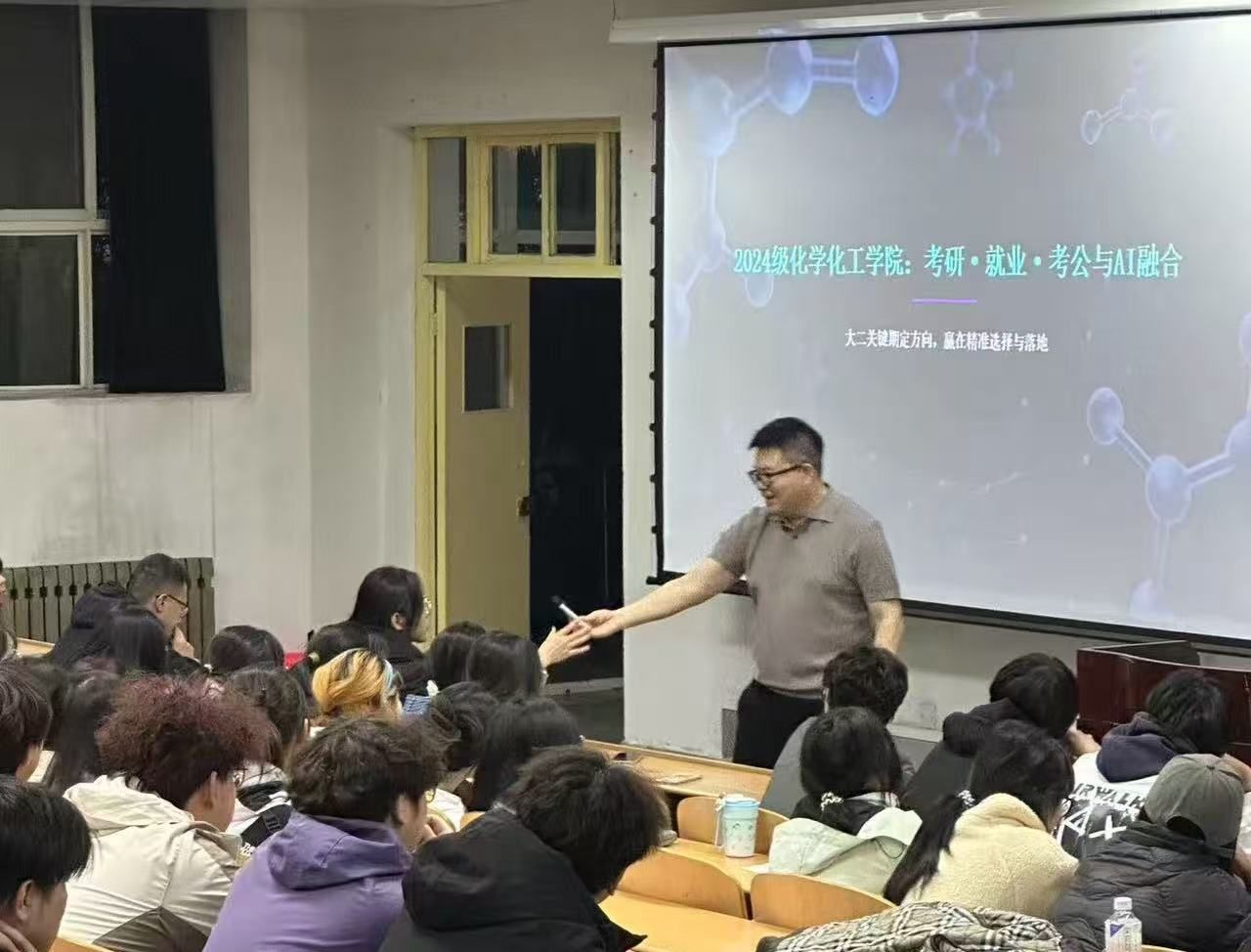 隨后,蔡乾鋒結(jié)合自身成長經(jīng)歷與職業(yè)實踐,圍繞考研、就業(yè)、考公與AI融合核心主題展開深度分享。他立足化學(xué)化工行業(yè)發(fā)展現(xiàn)狀,精準剖析AI技術(shù)對傳統(tǒng)學(xué)業(yè)備考、職業(yè)賽道的賦能邏輯,通過具體案例講解AI工具在考研知識點梳理、就業(yè)簡歷優(yōu)化、考公政策解讀與能力提升中的實際應(yīng)用路徑,為同學(xué)們破解成長困惑、明晰前行方向。他重點指出,大二正是明確方向、提前布局的起步期。在升學(xué)方向,他建議同學(xué)們盡早確定目標院校,重點復(fù)盤高數(shù)、英語及專業(yè)核心課,尤其要重視四六級的持續(xù)刷分與能力提升,為考研英語打下堅實基礎(chǔ);在就業(yè)方向,他強調(diào)大二應(yīng)開始關(guān)注行業(yè)動態(tài),利用課余時間考取基礎(chǔ)證書,參與科研實驗與社會實踐,提升綜合競爭力;在考公方向,他提醒同學(xué)們提前了解崗位招錄要求,合理平衡課堂學(xué)習(xí)與備考時間。