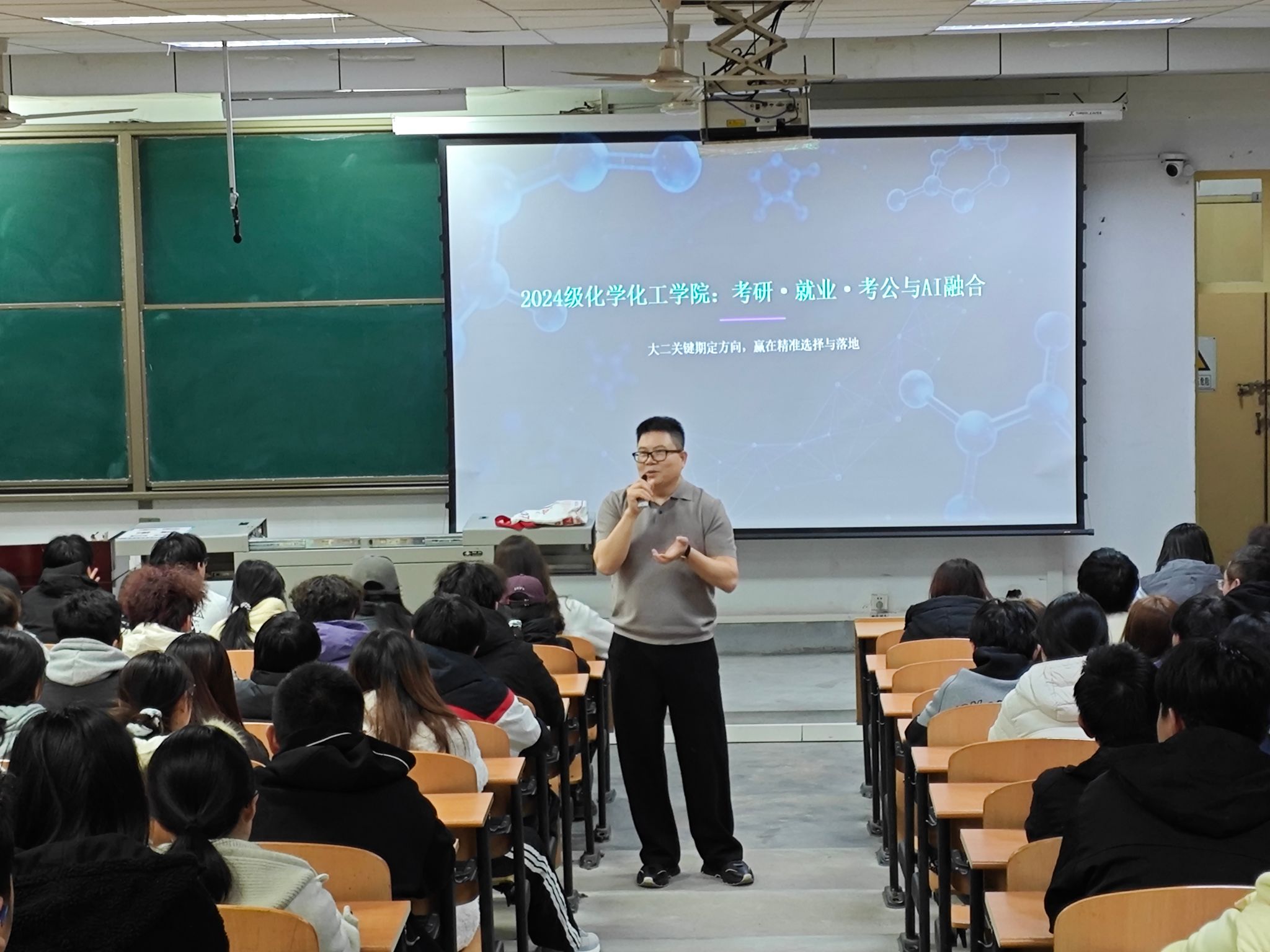 春回大地,萬象更新。為深入貫徹落實新學(xué)期學(xué)風(fēng)建設(shè)要求,引導(dǎo)大二學(xué)生搶抓關(guān)鍵期機遇,科學(xué)規(guī)劃職業(yè)生涯,同時強化同學(xué)們的數(shù)字化素養(yǎng)與AI意識,3月9日晚,化學(xué)化工學(xué)院特邀“青舟”導(dǎo)師蔡乾鋒舉辦“考研·就業(yè)·考公與AI融合”專題分享會。學(xué)院2024級全體學(xué)生參會,會議由2024級輔導(dǎo)員王蓉主持。