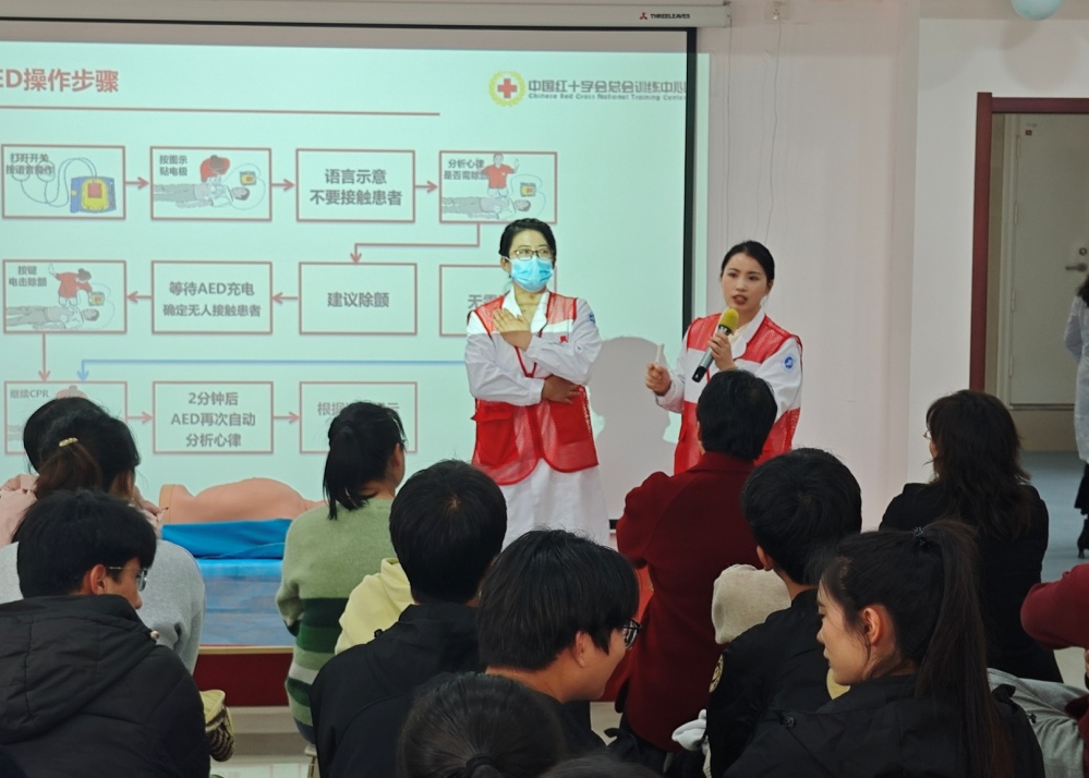 本次培訓由校醫(yī)院講師譚亞主講。她系統(tǒng)講解了心肺復蘇(CPR)操作流程、自動體外除顫器(AED)使用方法、氣道異物梗阻急救(海姆立克急救法)等關鍵內(nèi)容,細致示范按壓位置、深度、頻率等技術要點,逐項拆解AED操作規(guī)范,并通過情景互動強化記憶,幫助參訓師生快速掌握核心救命技能,切實提升應急處置意識與能力。