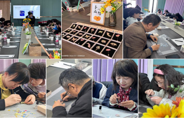 黨課悟思想,鐵魂融指尖。接下來的非遺螺鈿手作環(huán)節(jié)將紅色文化與傳統(tǒng)工藝相融,以“指尖匠心傳初心,巧手精工鑄信仰”為理念,全體教師在專業(yè)老師的指導下,沉浸式體驗螺鈿胸針打磨、鑲嵌、塑形的全過程。制作中,大家以“嚴細實”的工作作風要求自己,對每一片貝殼原料精挑細選,每一次打磨精益求精,每一處鑲嵌一絲不茍,正如鐵人先輩勘探油田時追求精準、打磨技藝時力求極致的執(zhí)著,也與外語教學中對語言細節(jié)的精研、對育人質(zhì)量的堅守高度契合。本環(huán)節(jié)將紅色元素融入螺鈿創(chuàng)作,讓非遺技藝成為承載初心使命的生動載體。大家在親手制作中,深刻體悟“以匠心守初心、以精工踐實干”的精神內(nèi)涵,讓正確政績觀在指尖實踐中入腦入心,讓鐵人精神在精雕細琢中根植于心、見于行止。