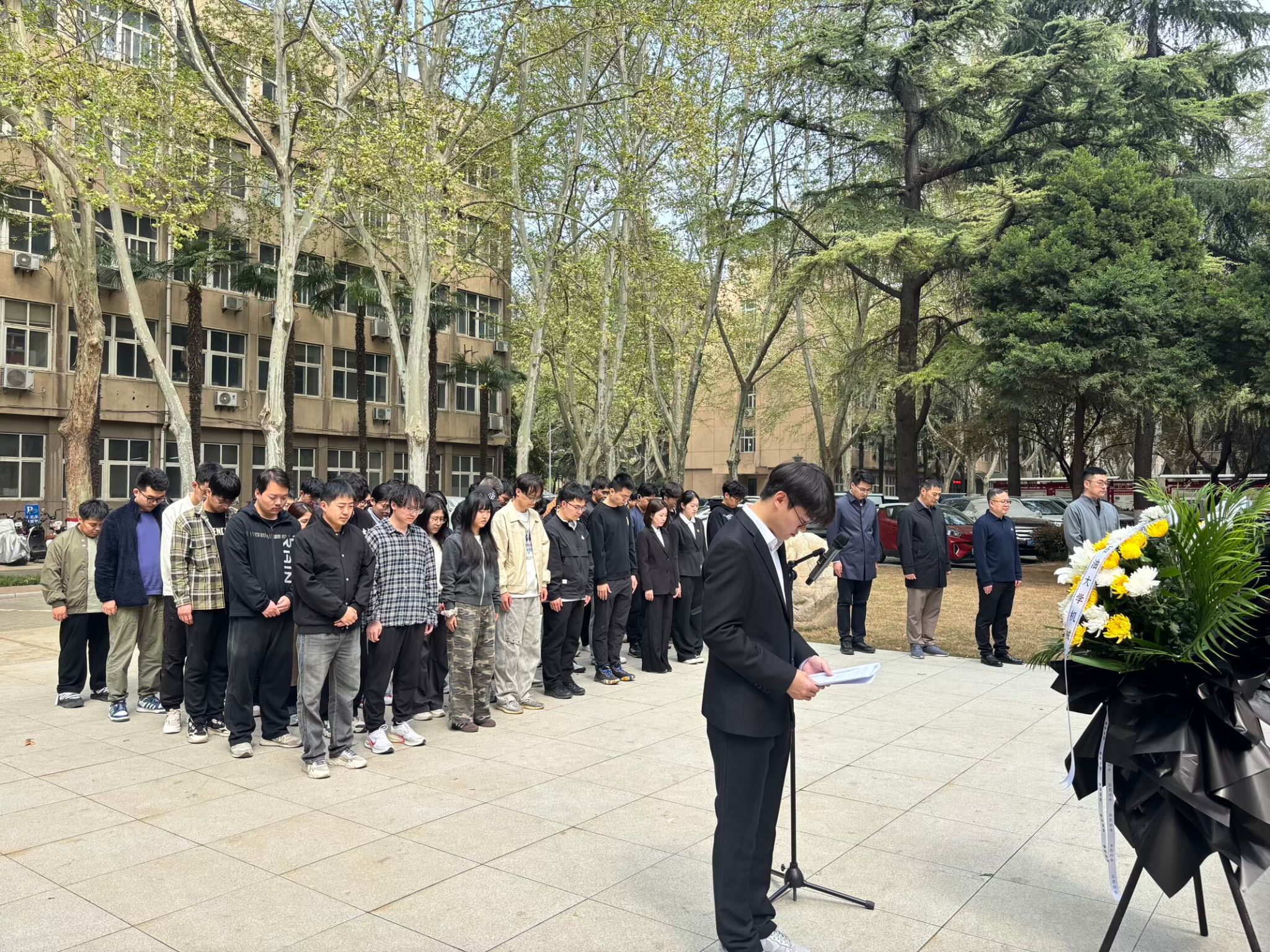 祭掃儀式上,孟開元、劉少胡代表學院整理了花圈挽聯(lián),隨后全體師生依次瞻仰唐春雨烈士塑像,敬獻鮮花、鞠躬致敬,并默哀一分鐘,表達對唐春雨烈士的深切哀思與無限緬懷。