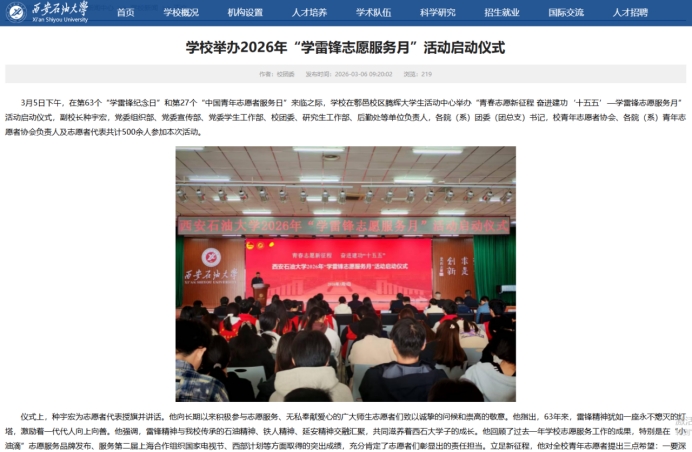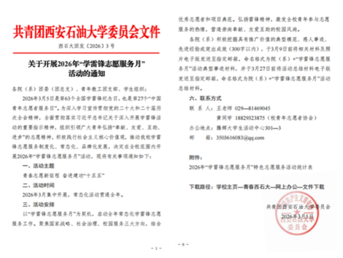 校團(tuán)委高度重視,結(jié)合學(xué)校年度工作要點(diǎn)與育人實(shí)際,于3月5日印發(fā)《關(guān)于開展2026年“學(xué)雷鋒志愿服務(wù)月”活動(dòng)的通知》(西石大團(tuán)發(fā)〔2026〕3號(hào)),對(duì)全年特別是3月份的學(xué)雷鋒志愿服務(wù)工作進(jìn)行了系統(tǒng)安排?!锻ㄖ访鞔_了“服務(wù)重大戰(zhàn)略、踐行為民宗旨、深入基層治理、融匯學(xué)科優(yōu)勢(shì)、厚植校園沃土”五大活動(dòng)方向,為全?;顒?dòng)開展提供了清晰指引。各院(系)團(tuán)委、各級(jí)學(xué)生組織迅速響應(yīng),結(jié)合學(xué)科專業(yè)特色,制定了具體可行的實(shí)施方案,形成了校院聯(lián)動(dòng)、分工明確、責(zé)任到人的工作格局,確保了各項(xiàng)活動(dòng)有計(jì)劃、有步驟地扎實(shí)推進(jìn)。