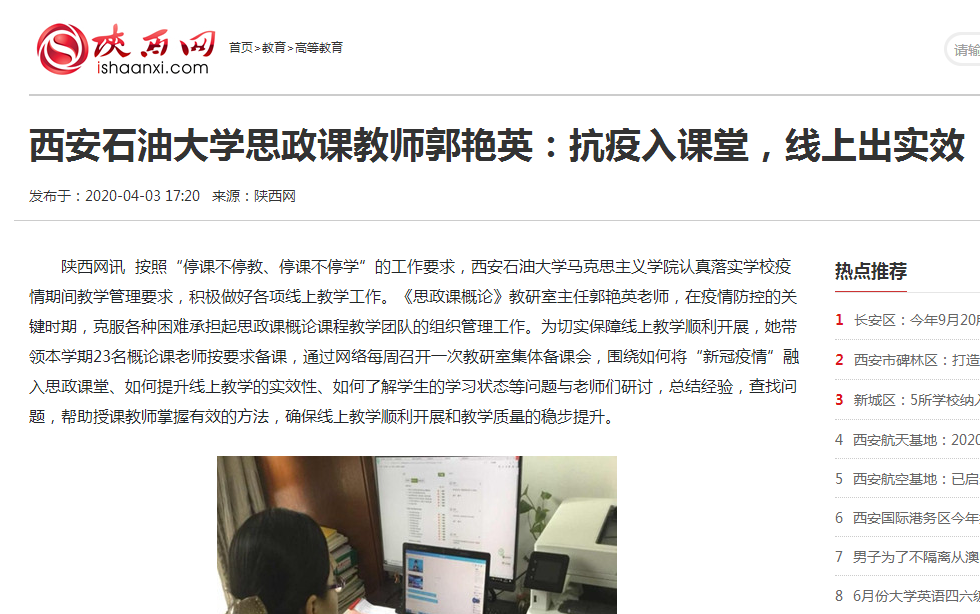 按照“停課不停教、停課不停學(xué)”的工作要求,西安石油大學(xué)馬克思主義學(xué)院認(rèn)真落實(shí)學(xué)校疫情期間教學(xué)管理要求,積極做好各項(xiàng)線上教學(xué)工作?!端颊n概論》教研室主任郭艷英老師,在疫情防控的關(guān)鍵時(shí)期,克服各種困難承擔(dān)起思政課概論課程教學(xué)團(tuán)隊(duì)的組織管理工作。為切實(shí)保障線上教學(xué)順利開展,她帶領(lǐng)本學(xué)期23名概論課老師按要求備課,通過(guò)網(wǎng)絡(luò)每周召開一次教研室集體備課會(huì),圍繞如何將“新冠疫情”融入思政課堂、如何提升線上教學(xué)的實(shí)效性、如何了解學(xué)生的學(xué)習(xí)狀態(tài)等問(wèn)題與老師們研討,總結(jié)經(jīng)驗(yàn),查找問(wèn)題,幫助授課教師掌握有效的方法,確保線上教學(xué)順利開展和教學(xué)質(zhì)量的穩(wěn)步提升。