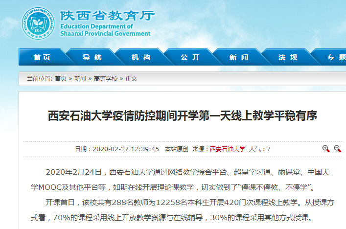 2020年2月24日,西安石油大學通過網(wǎng)絡(luò)教學綜合平臺、超星學習通、雨課堂、中國大學MOOC及其他平臺等,如期在線開展理論課教學,切實做到了“停課不停教、不停學”。