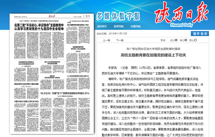 本報訊 (記者 周明)11月12日,省委常委、省委組織部部長張廣智深入西安石油大學(xué)調(diào)研“不忘初心、牢記使命”主題教育開展情況。