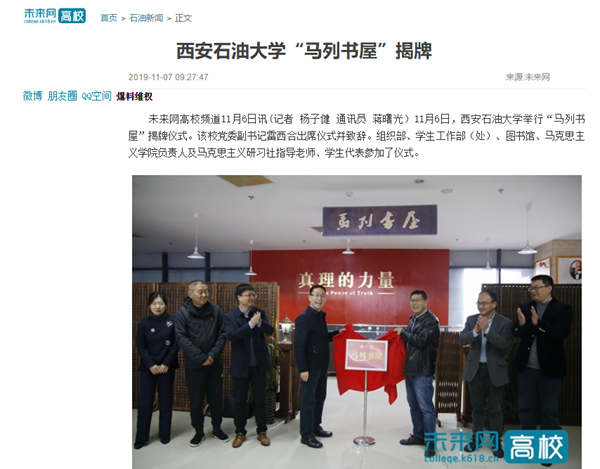 11月6日,西安石油大學(xué)舉行“馬列書屋”揭牌儀式。該校黨委副書記雷西合出席儀式并致辭。組織部、學(xué)生工作部(處)、圖書館、馬克思主義學(xué)院負(fù)責(zé)人及馬克思主義研習(xí)社指導(dǎo)老師、學(xué)生代表參加了儀式。