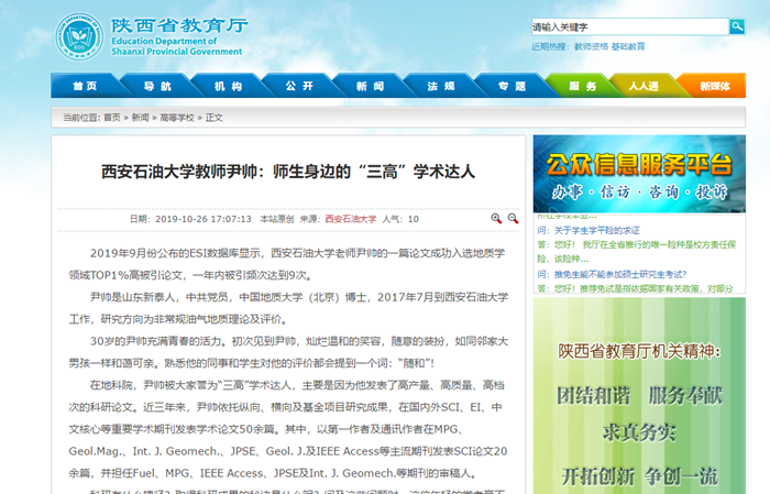 2019年9月份公布的ESI數(shù)據(jù)庫(kù)顯示,西安石油大學(xué)老師尹帥的一篇論文成功入選地質(zhì)學(xué)領(lǐng)域TOP1%高被引論文,一年內(nèi)被引頻次達(dá)到9次。