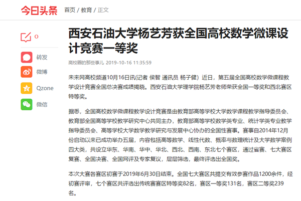未來網(wǎng)高校頻道10月16日訊(記者 侯智 通訊員 楊子健)近日,第五屆全國高校數(shù)學(xué)微課程教學(xué)設(shè)計競賽全國總決賽成績揭曉。西安石油大學(xué)理學(xué)院楊藝芳老師榮獲全國一等獎和西北賽區(qū)特等獎。