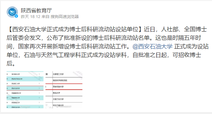 近日,人社部、全國(guó)博士后管委會(huì)發(fā)文,公布了批準(zhǔn)新設(shè)的博士后科研流動(dòng)站名單。這也是時(shí)隔五年時(shí)間,國(guó)家再次開(kāi)展新增設(shè)博士后科研流動(dòng)站工作。西安石油大學(xué)正式成為設(shè)站單位,石油與天然氣工程學(xué)科正式成為設(shè)站學(xué)科,自批準(zhǔn)之日起,可招收博士后。