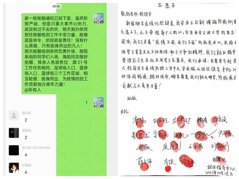 大“疫”面前,人人有責,人人盡責。在眾多的學生志愿者中,由學生工作部(處)就業(yè)指導中心組織的18名大學生管理見習生志愿者分外搶眼。無論是在凌晨、還是深夜,他們24小時待命,隨時集結。在鄠邑校區(qū)全員核酸檢測的現(xiàn)場,每次都有他們忙碌的身影,往往是連續(xù)奮戰(zhàn)10幾個小時。他們秉持“團結、務實、認真、高效”理念,敢于沖鋒、敢于斗爭、敢于勝利,鍛造出堅如磐石、舍生忘己、心懷眾“生”的可貴品質。
