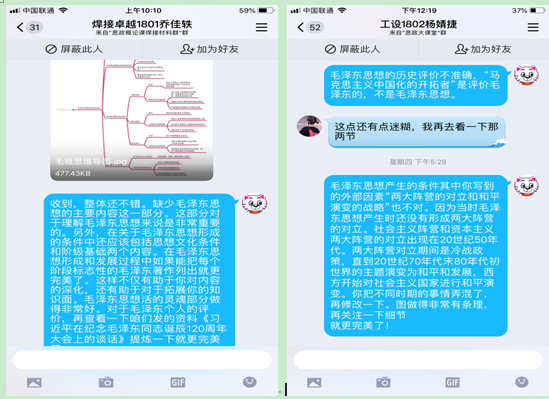 課后,郭老師利用QQ群對學生進行及時的輔導和交流,及時關注學生對教學效果的反饋。針對學生的差異性,她還布置了個性化和自主性的作業(yè),實現(xiàn)了一對一的輔導。學生除必須完成的作業(yè)外,還布置了可以自主選擇性的作業(yè)。如通過思維導圖的方式梳理所學內容的作業(yè),疫情之下的線上教學學生學習的效果如何,通過思維導圖對所學內容進行梳理,可以及時了解學生對教學內容的掌握情況,同時也有助于提升學生的邏輯思維能力和概括能力。課后針對學生所做的思維導圖,進行一對一的指導,再把學生的作業(yè)發(fā)到學生QQ群中,鼓勵引導更多的學生積極參與。用自主性作業(yè)的方式和一對一的指導,滿足了多層次學生的需求,教學效果較好。如品讀馬克思主義經(jīng)典原著,形成PPT進行成果匯報的作業(yè),通過這一作業(yè)形式讓學生更好的學經(jīng)典、悟原理、勤思考,讓學生學會用真理的光芒照亮前行的路。
