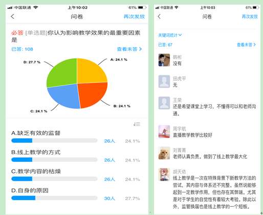 為了更好推進后續(xù)的教學,郭老師在兩周線上教學結束后及時對學生進行問卷調查,了解學生的學習狀態(tài)、學習效果和學習需求。