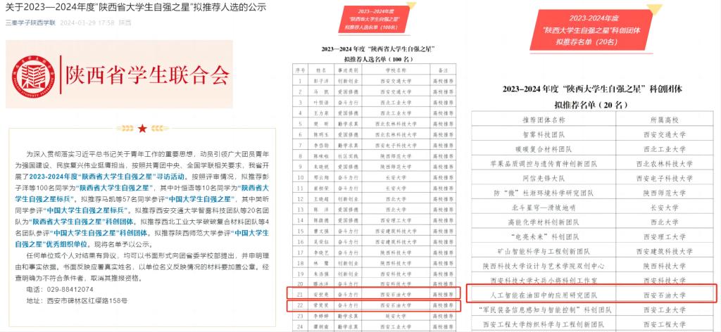 近日,由團(tuán)省委、省學(xué)聯(lián)開(kāi)展的尋訪2023-2024年度“陜西省大學(xué)生自強(qiáng)之星”活動(dòng)結(jié)果揭曉,我校石油工程學(xué)院儲(chǔ)運(yùn)2103班安世亮、經(jīng)濟(jì)管理學(xué)院商務(wù)2101班常笑笑榮獲“陜西省大學(xué)生自強(qiáng)之星”,石油工程學(xué)院“人工智能在油田中的應(yīng)用研究”團(tuán)隊(duì)榮獲“陜西大學(xué)生自強(qiáng)之星”科創(chuàng)團(tuán)體,其中安世亮被擬推薦為2023-2024年度“中國(guó)大學(xué)生自強(qiáng)之星”候選人。