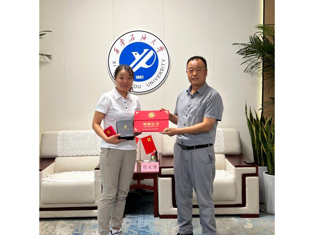 程永清為何靜頒發(fā)捐贈(zèng)證書、校友徽章及“一滴油”紀(jì)念品。